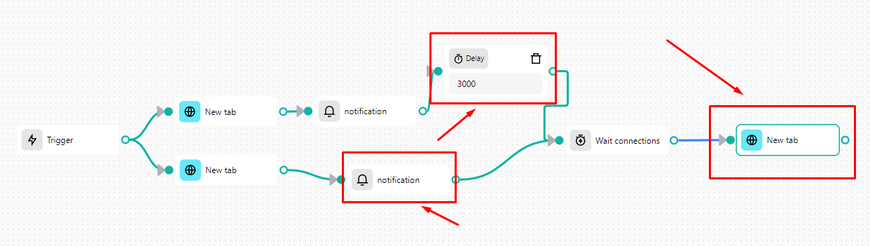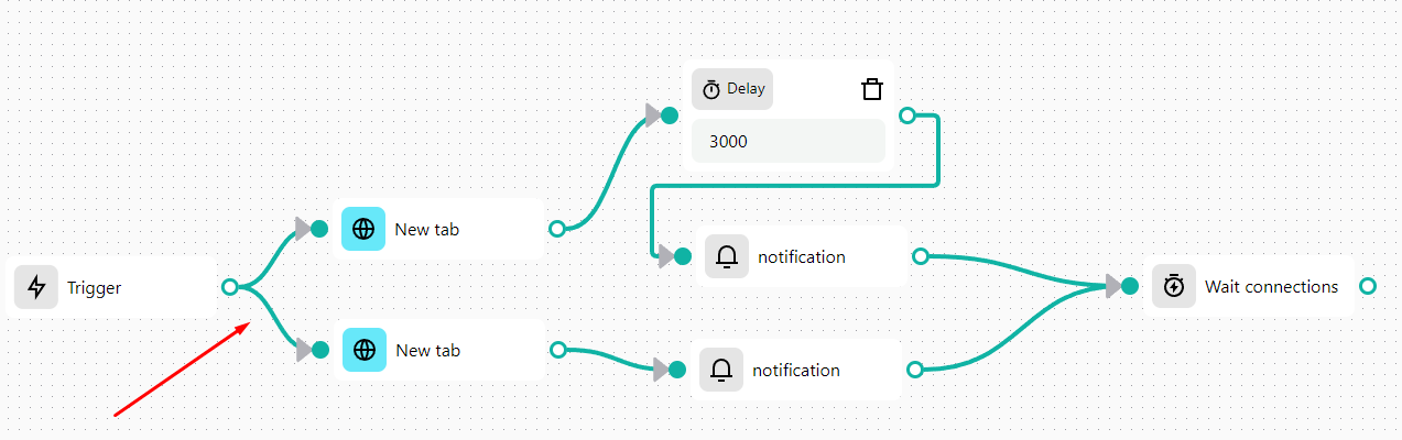 Note that no condition blocks are placed here, so both branches can be executed simultaneously. To wait for the execution of all the parallel threads of execution in the workflow, we need the Wait Connections block. *The Timeout (milliseconds)* value of the block sets how long the block waits for the whole thread to finish execution, the default value is 10 000 ms (10 seconds). When the timeout is reached, the workflow will continue to execute the next block.