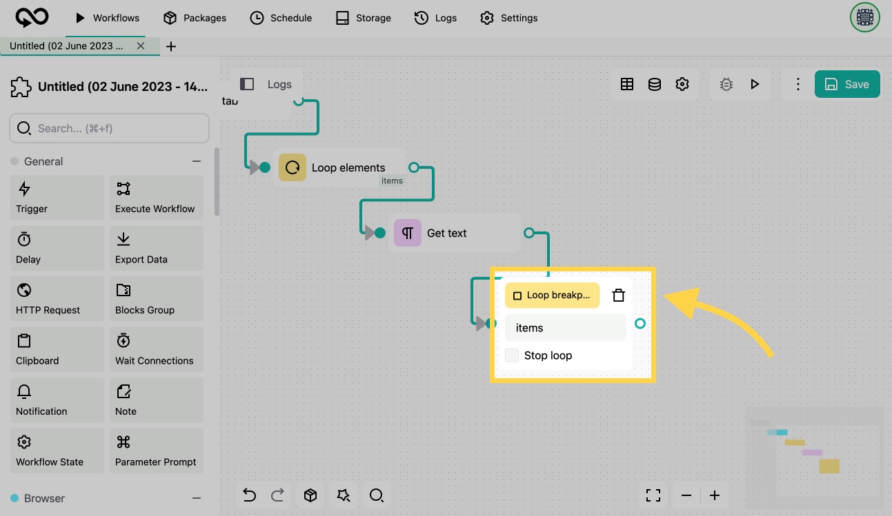 6. To terminate the loop, add a [Loop Breakpoint](https://docs.goless.com/blocks/control-flow/loop-breakpoint) and specify the id of the Loop elements, which is `items` in our case.