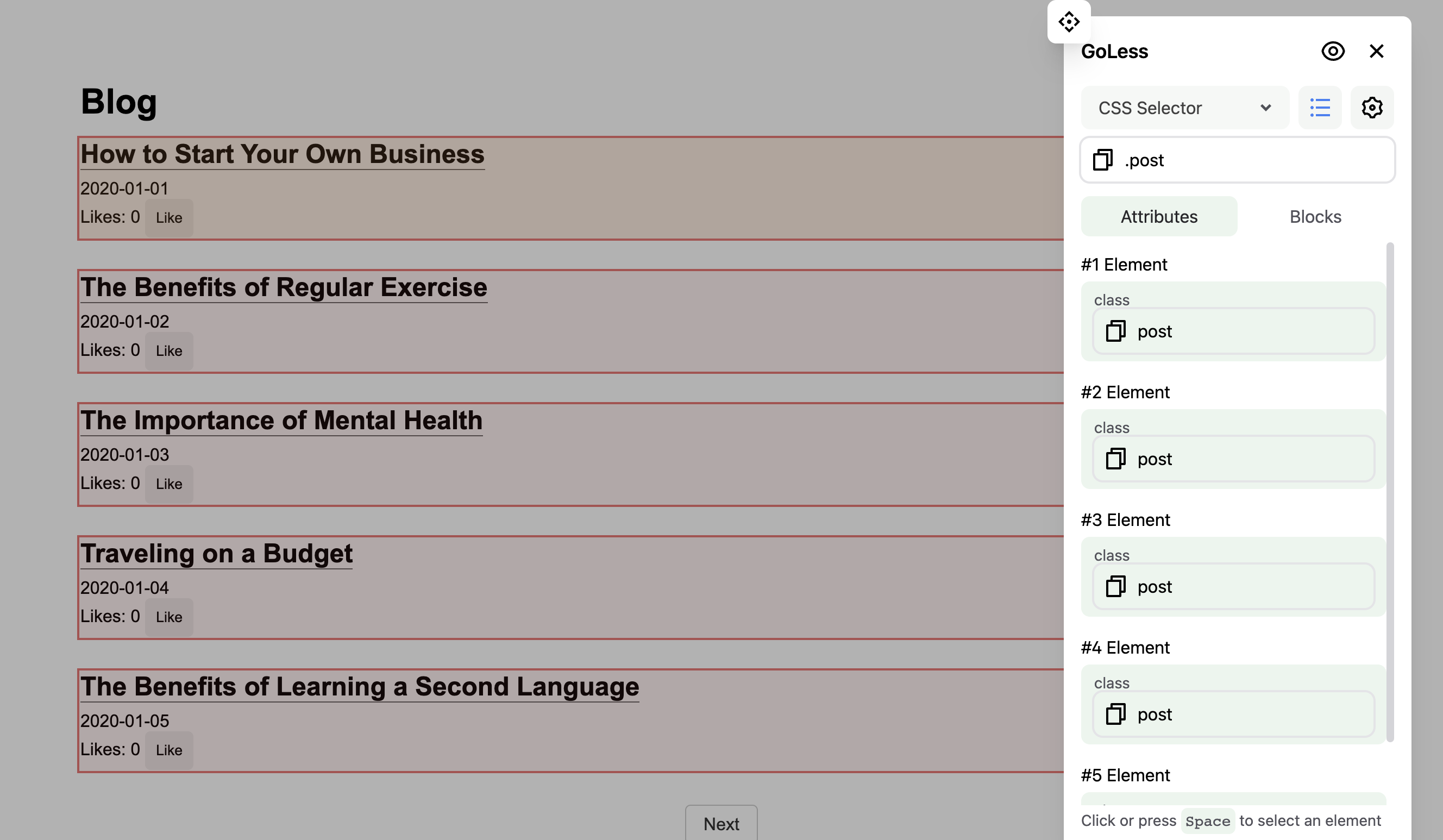 * To select this `.post` class, visit the demo.goless.com site and enable Element Selector in the extension.