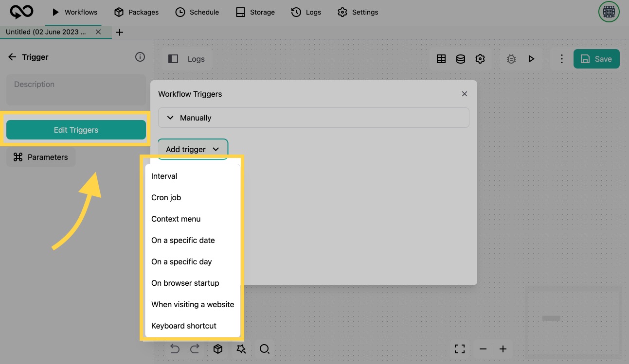 3. You have the option to select a different trigger or add multiple triggers for your automation. These could include intervals, schedules, context menus (right-click on web pages), specific dates, on browser start-up, or keyboard shortcuts.
