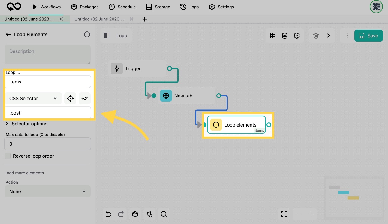 5. Next, we add a "[Loop elements](https://docs.goless.com/blocks/control-flow/loop-elements-block)" block. This block will iterate over the elements on the page as a list. We need to capture all blocks with the class `.post`. Thus, we specify the CSS Selector as `.post`.