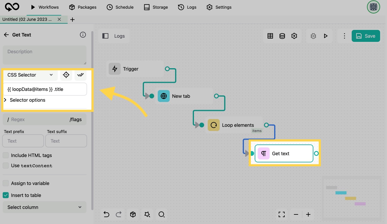 6. Next, within the `.post` element, we need to get the title. To do this, we add a "[Get text](https://docs.goless.com/blocks/web-interaction/get-text-block)" block to our workflow. In the settings, we specify: `{{ loopData@items }} .title` - here we instruct the script to take the elements from the previous block (items in our case, which should be pre-defined as **Loop ID**) and search within it for the CSS class `.title`.